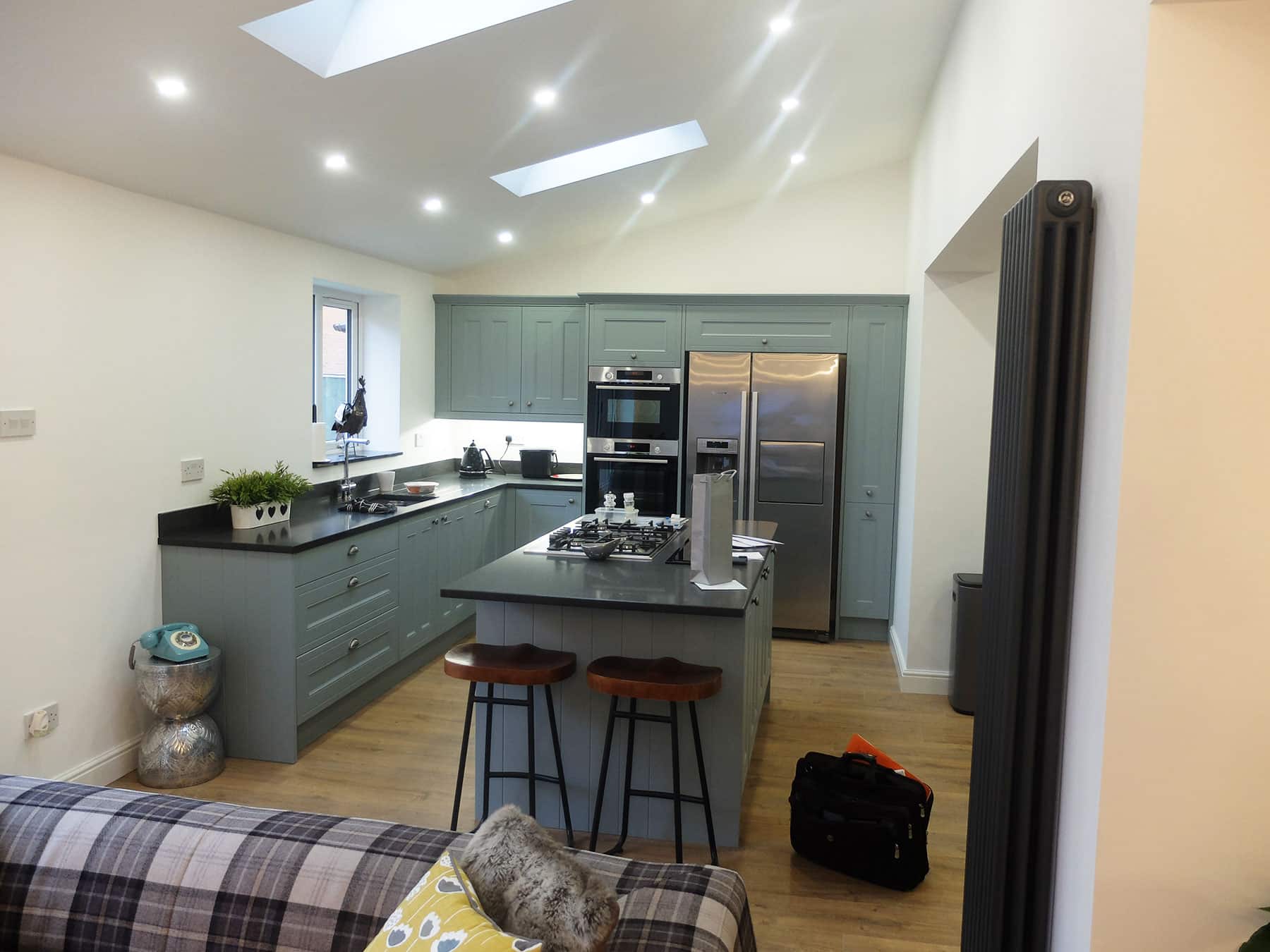 The build specification included removing a large section of brickwork and fitting RSJ’s. The extension was approx. 9 mtrs x 3.5 mtrs and extended the Kitchen and Living Room, it included 3.6 mtr Bi-fold doors, three electric Velux Roof Lights and a Wren Kitchen.